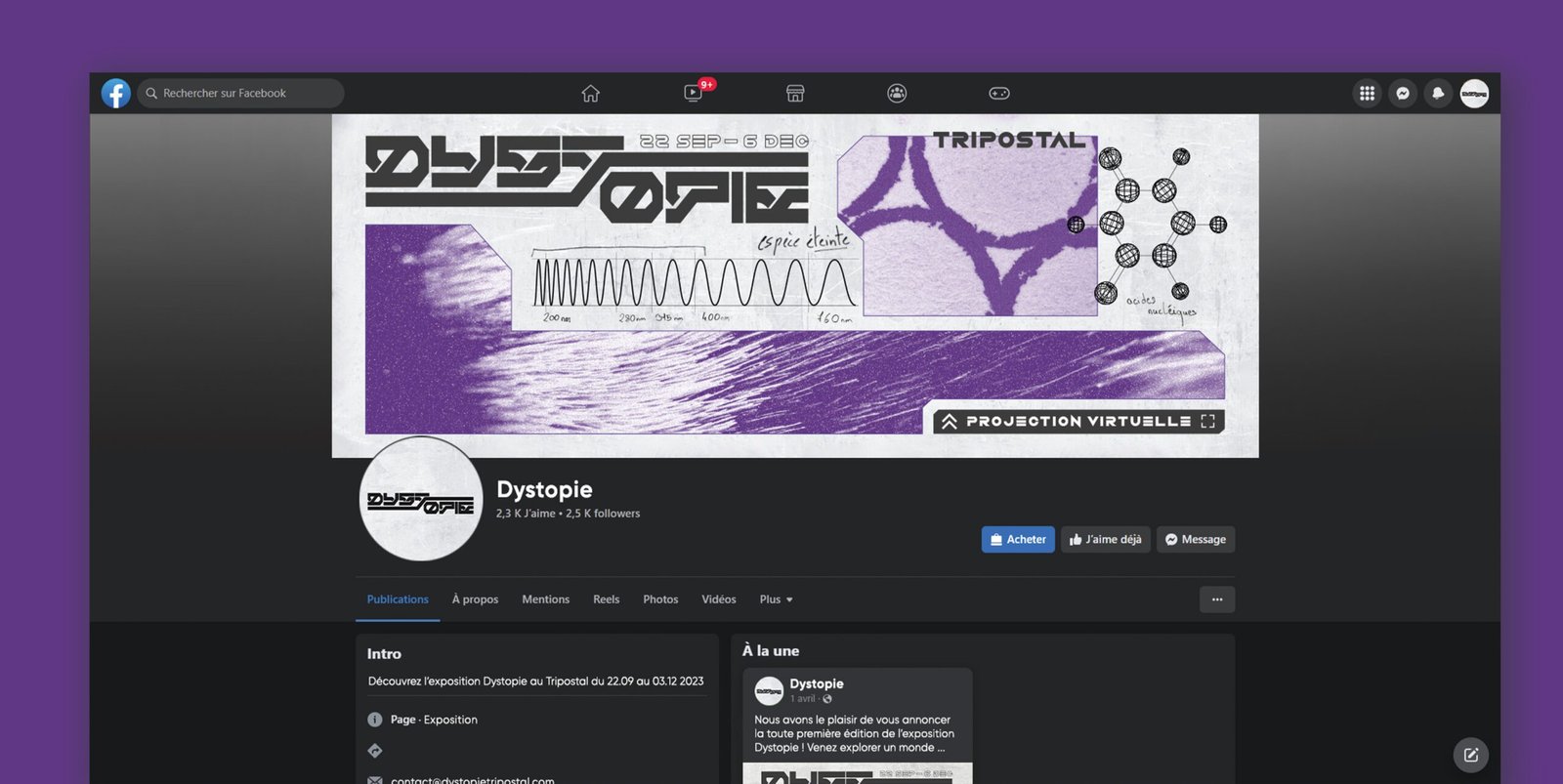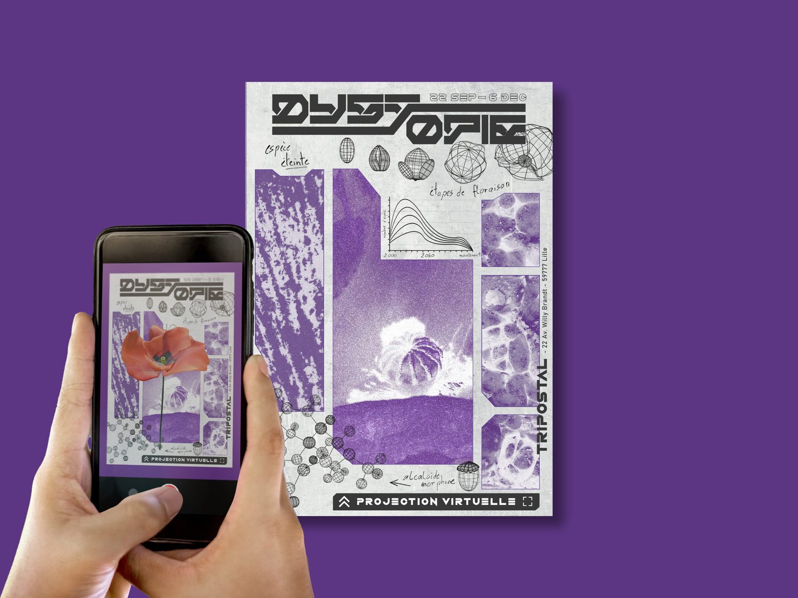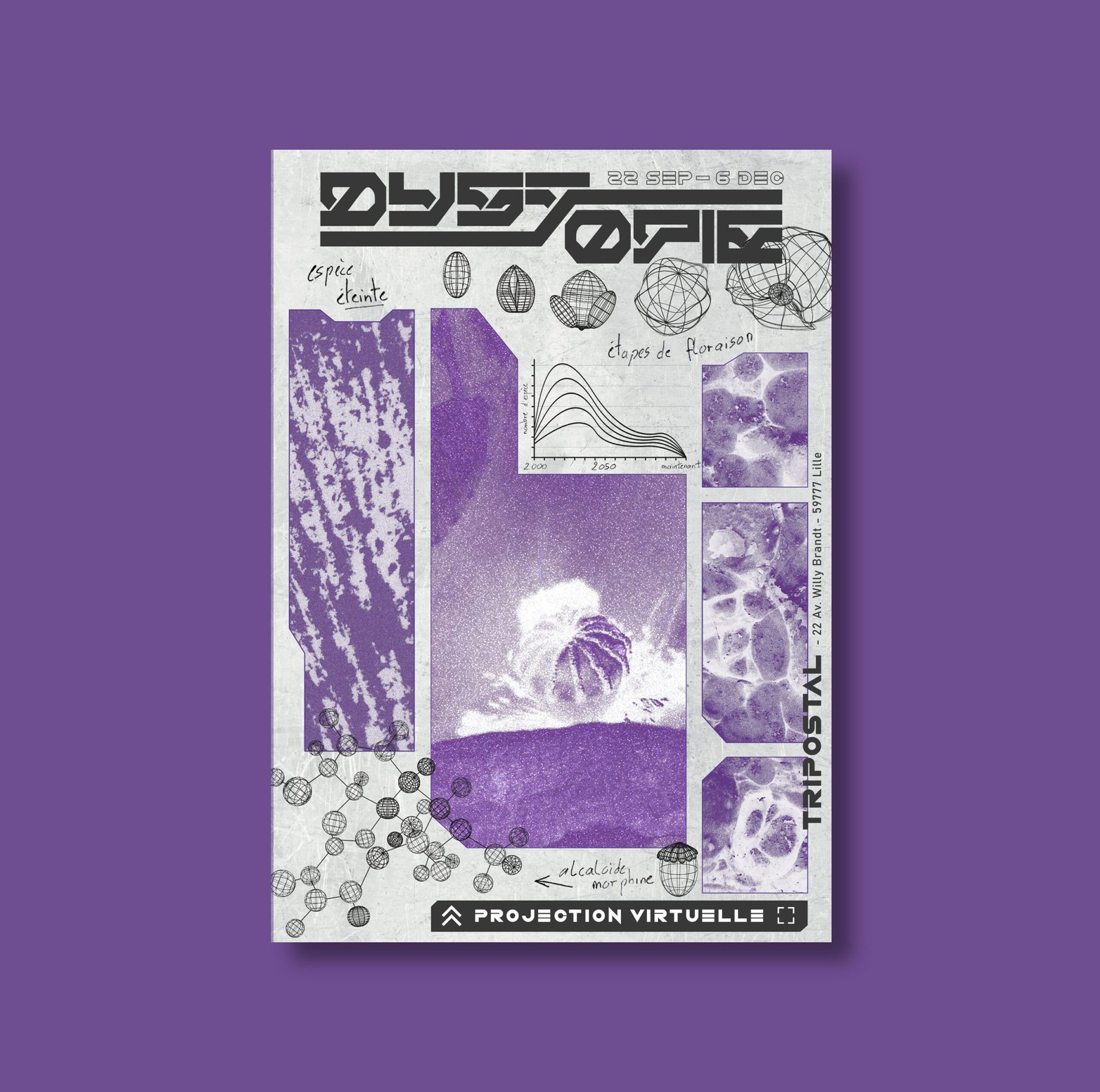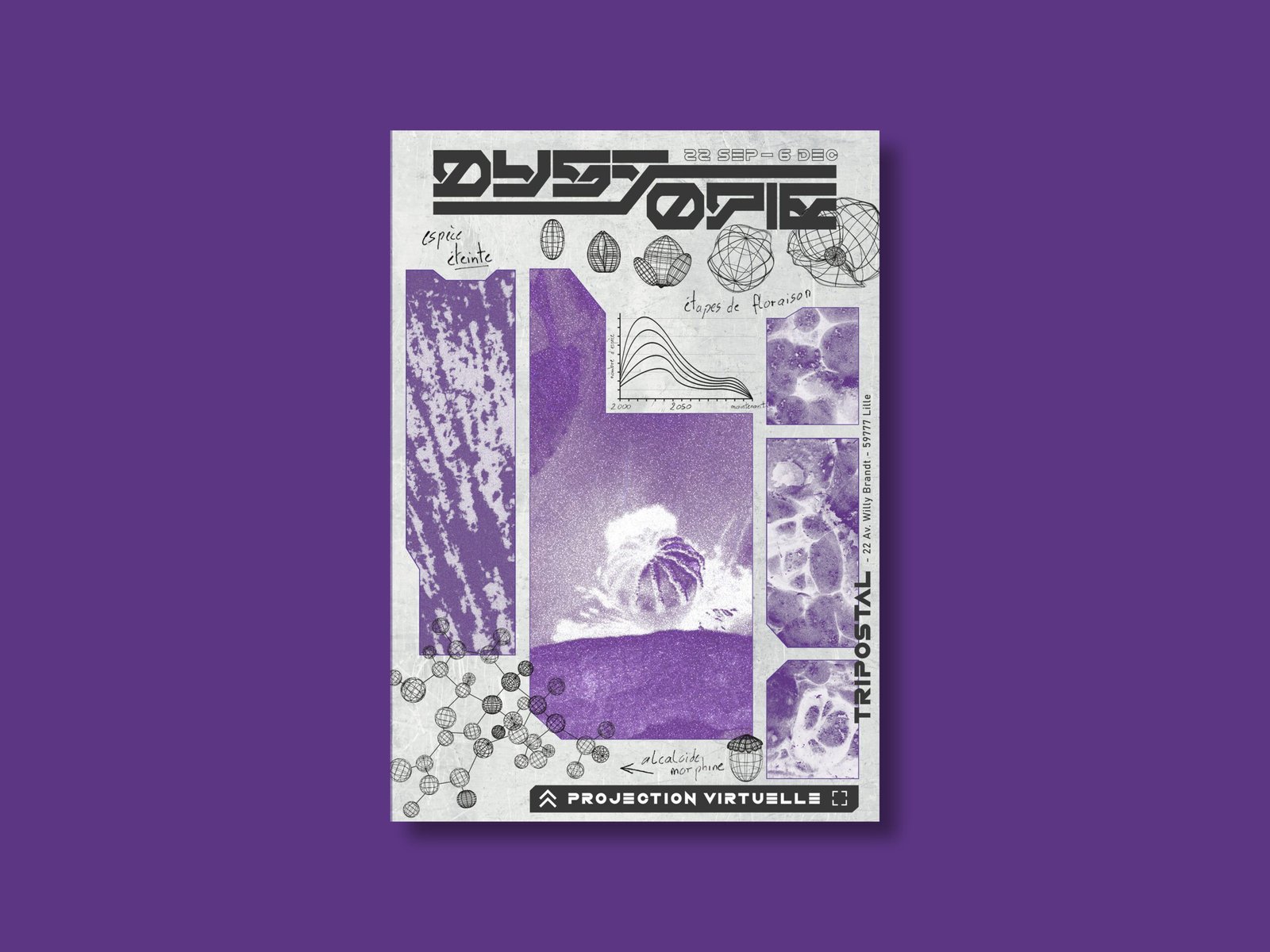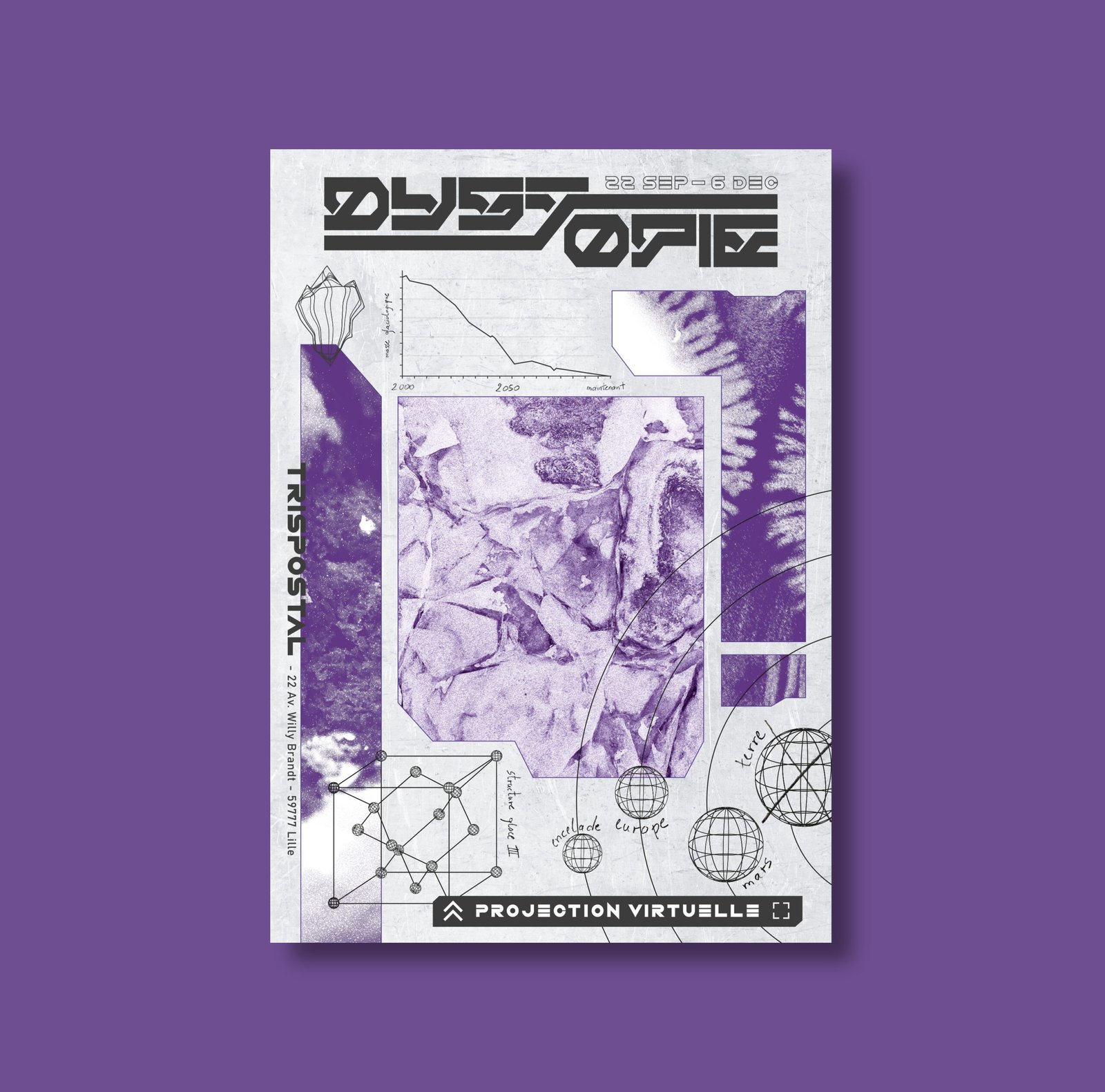 L’événement : Dans le cadre de ma dernière année d’études, nous devions créer un projet fictif graphique. Ainsi, j’ai eu l’idée de créer Dystopie, une exposition au Tripostal de Lille. Cette exposition a pour objectif de sensibiliser à l’urgence environnementale en illustrant un avenir désastreux résultant de nos comportements. L’idée principale est de projeter une perspective du futur où une grande partie de notre écosystème a disparu. Dans ce scénario apocalyptique, les seuls vestiges de l’écosystème seront leurs données et leurs informations.